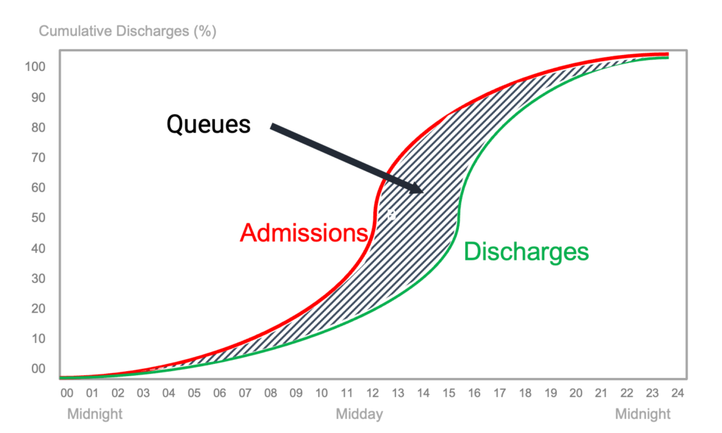 The number of available beds is fixed by the number of discharges. And because admissions tend to arrive in the middle of the day, by 12pm there are now wwaaaaayyy too many patients in the hospital – all queuing in the emergency department and in admissions units all over the hospital.