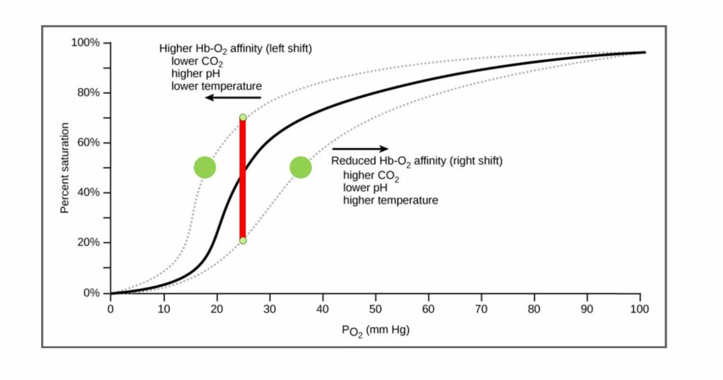 At the level of 30mmHg, the saturations are different in the left-hand curve (70%) compared to the right (20%) – as indicated by the top and bottom of the red line. This is because the ‘dropping off point’ – indicated by the green circles – moves from 35mmHg to 15mmHg on the horizontal axis.